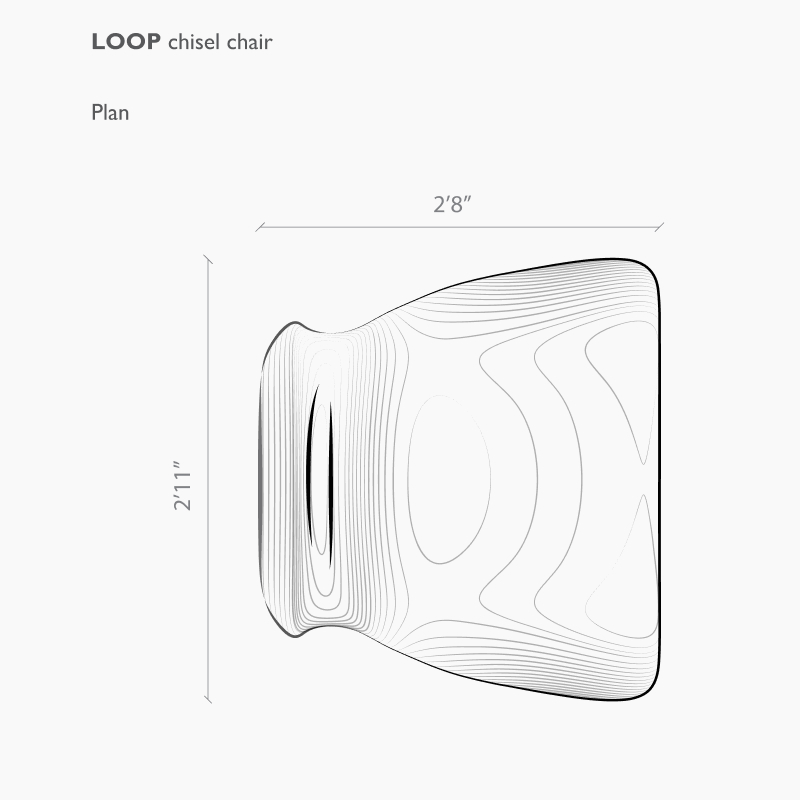 The LOOP chisel chair finds its strength in flow. Anchored at three points—the sides and the back—it carves a confident presence through a single, continuous surface. Its base lifts slightly off the ground, introducing a visual void that gives the chair its name and lends it a striking sense of lightness, despite its solid stance.