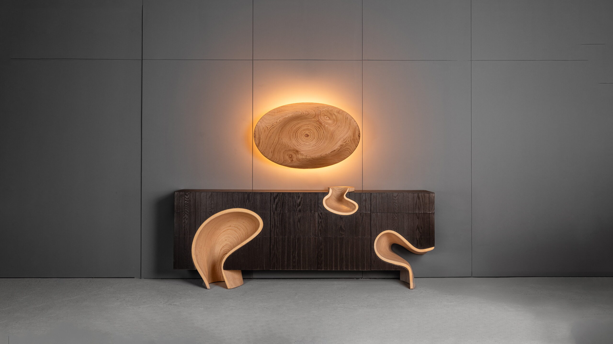 The LOOP masque wall light embodies a restrained elegance with its singular, undulating surface, behind which a diffused light source creates a soft, ambient glow. Intended as a versatile installation, this piece can function independently or be arranged in clusters, adapting effortlessly to a variety of spatial compositions. Ideal for placement above consoles or as a standalone statement, the LOOP masque wall light brings a refined touch to modern interiors, emphasizing form and light in harmonious balance.