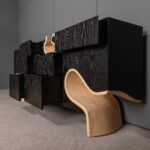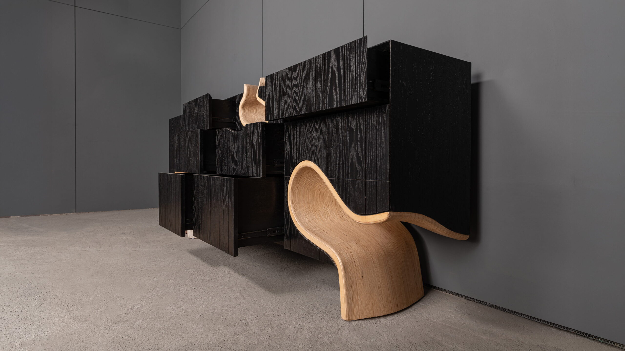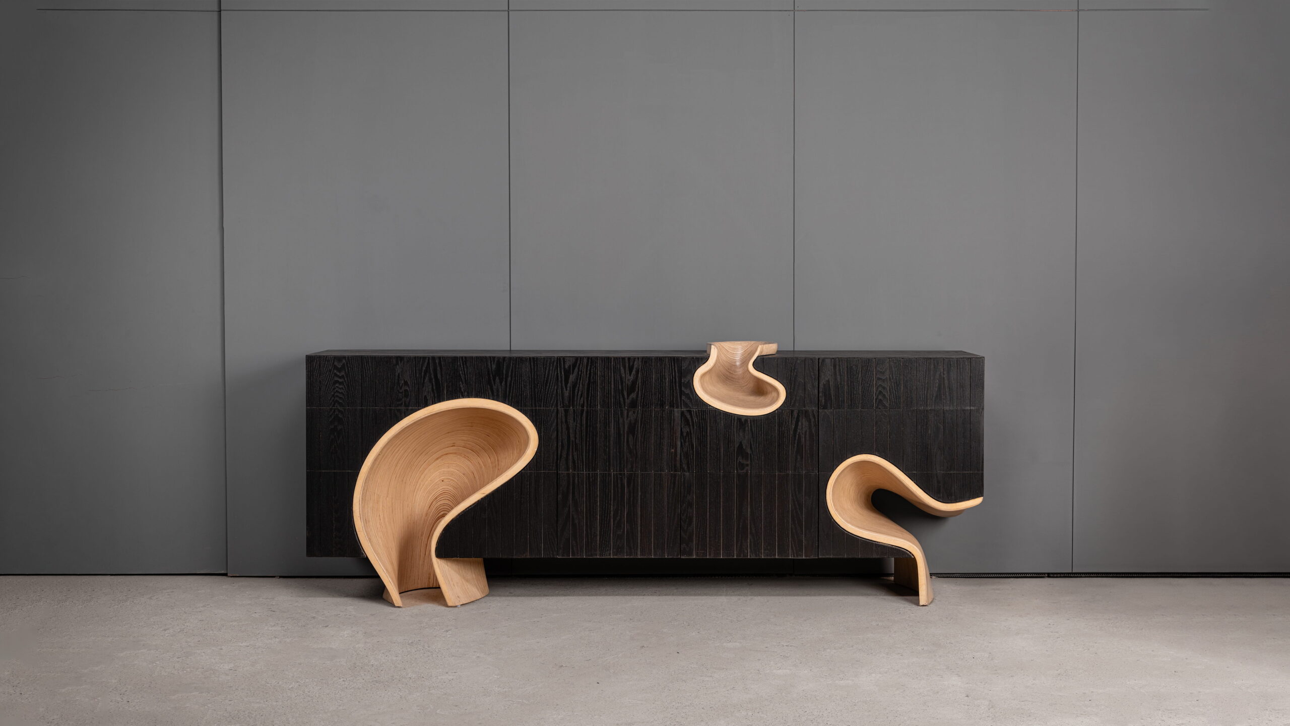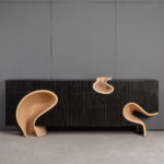 The LOOP Scoop Console is a perfect balance of fluid elegance and structural innovation. The console’s standout feature is its innovative looped legs that seamlessly transition from aesthetic elements to structural supports, grounding the piece in both beauty and strength. These intricately curved loops, crafted from natural wood, serve as the foundation while appearing to lift the console, creating a visual effect of weightlessness when viewed from certain angles. The contrasting black panels of the console offer sleek, modern sophistication, juxtaposed against the organic flow of the wooden loops.