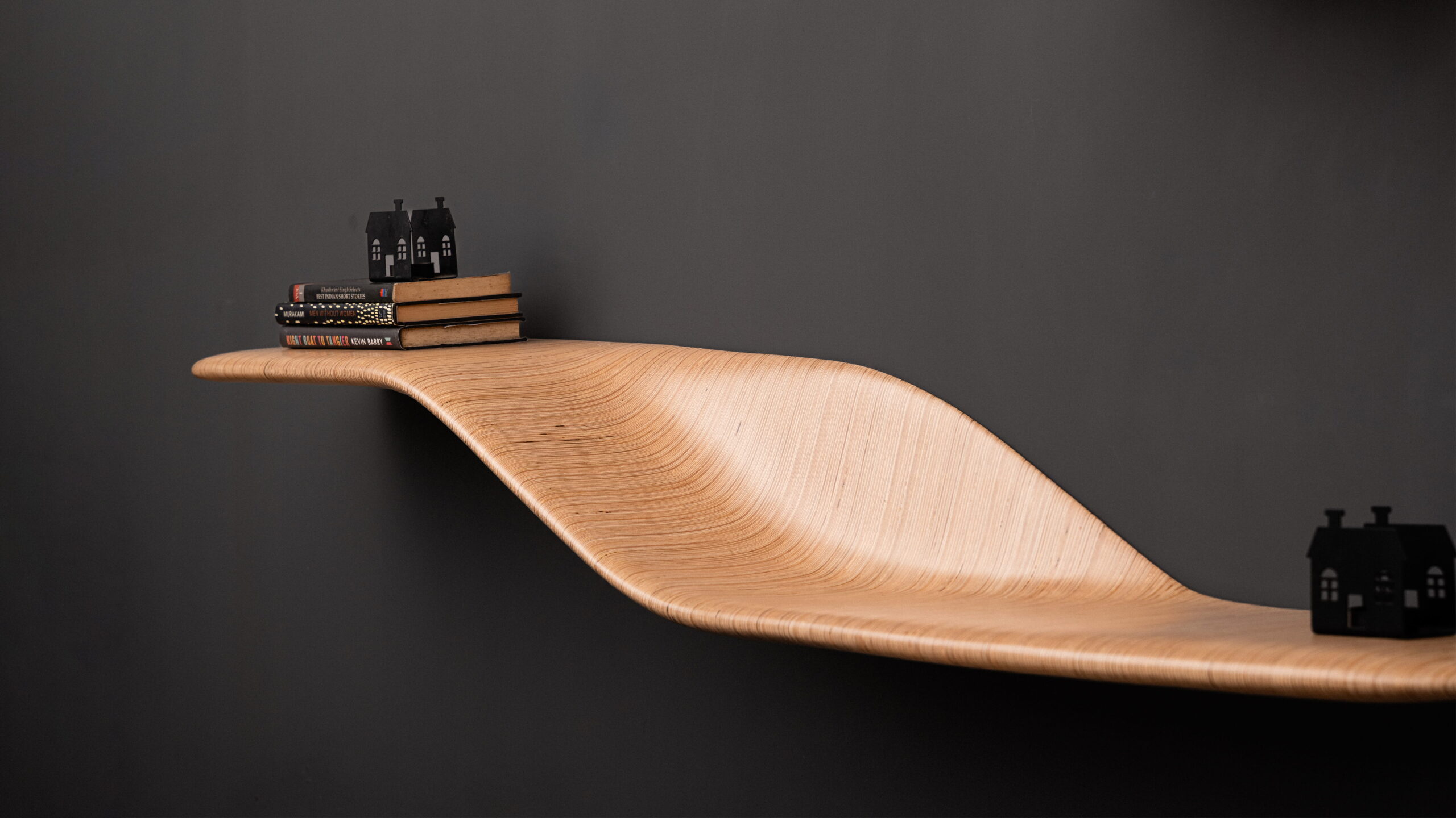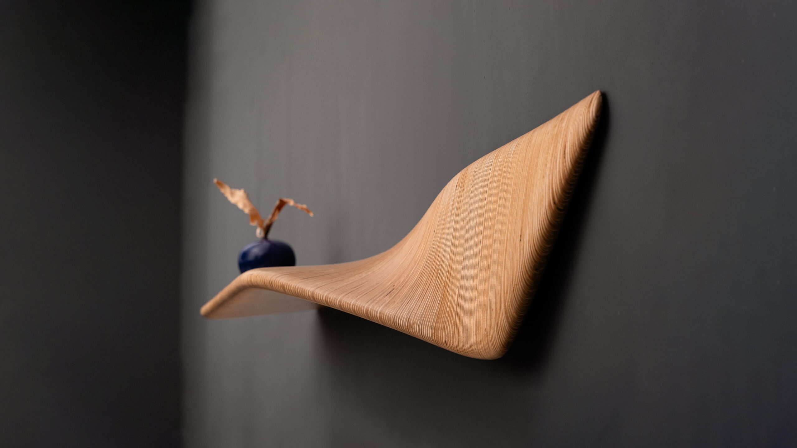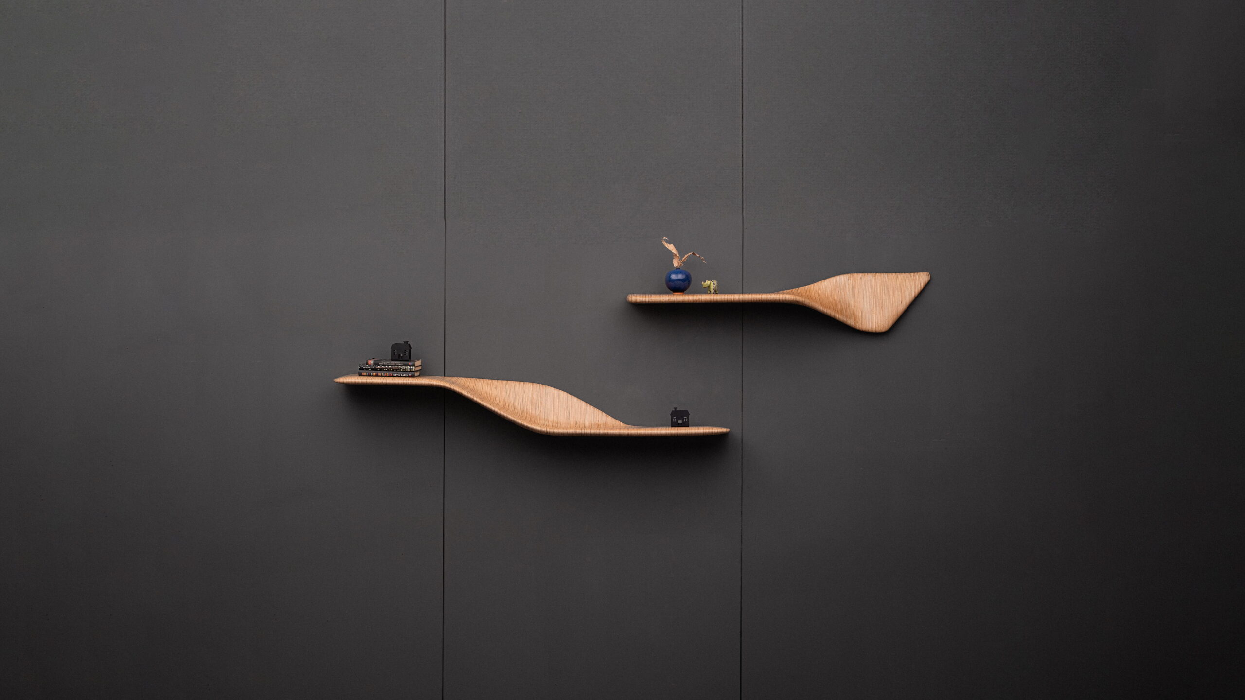 The LOOP step shelves turn the act of storage into sculptural intervention. Singular surfaces bend softly towards the wall and then back out, creating a quiet rhythm of rise and dip – like a contour line folding through space.