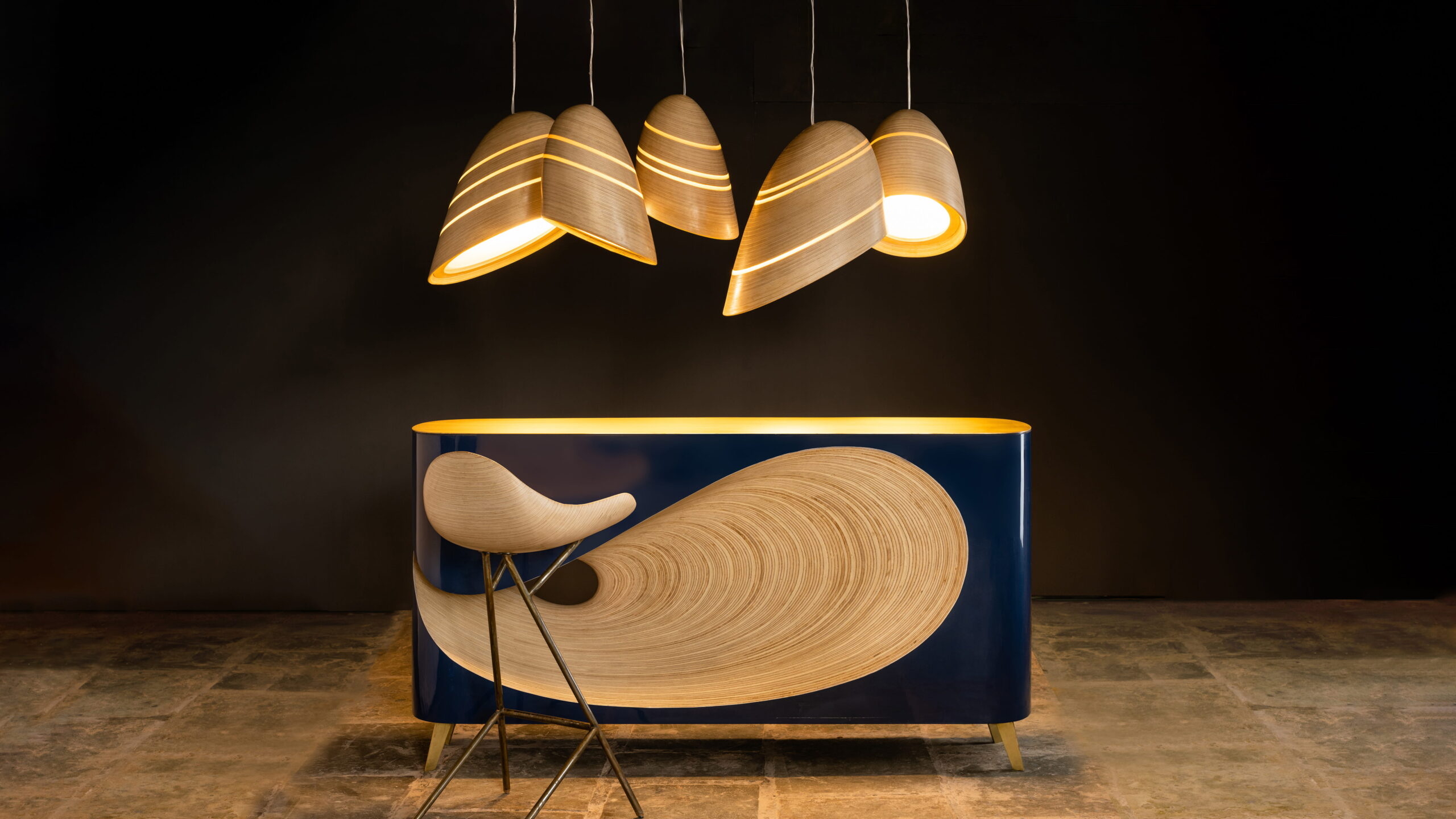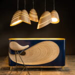 Suspended like stars in the night sky, the RAY pendant lights evoke a celestial comfort. These distorted funnel shapes with varying sizes and arrangements compose a dynamic constellation of design. Effortlessly paired with the LOOP bar unit, this ensemble crafts a haven of sophistication that brings forth an interstellar saga of style. The RAY pendant lights invite you to bask in the cosmos of your own creation.